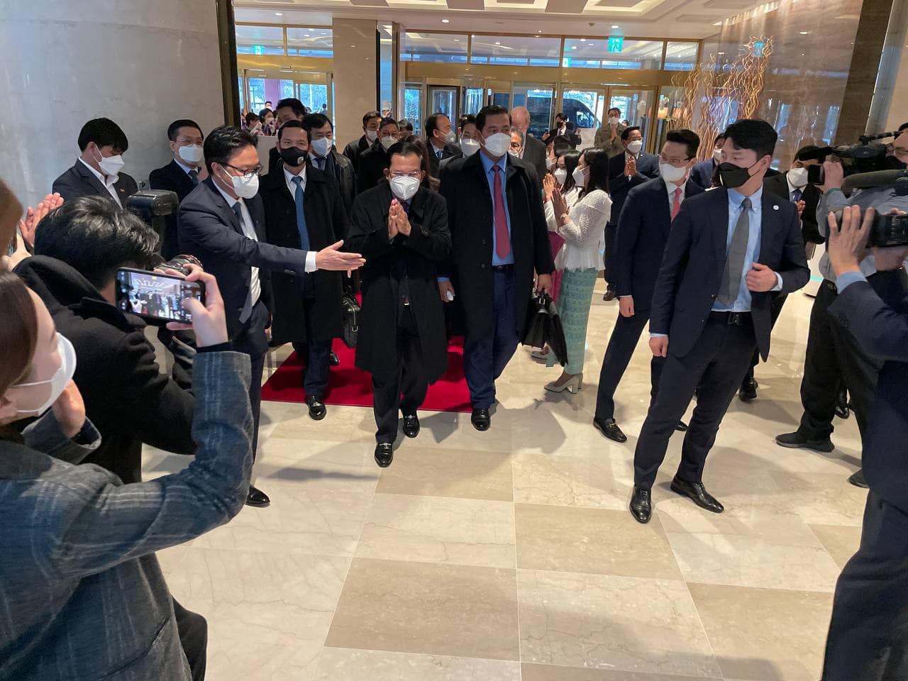 សម្តេចអគ្គមហាសេនាបតីតេជោ ហ៊ុន សែន នាយករដ្ឋមន្រ្តី នៃព្រះរាជាណាចក្រកម្ពុជា ត្រូវបានប្រជាពលរដ្ឋ និងយុវជនខ្មែរ ព្រមទាំងពលរដ្ឋកូរ៉េ ទទួលស្វាគមន៍យ៉ាងរាក់ទាក់ និងកក់ក្តៅបំផុត នៅពេលដែលសម្តេច អញ្ជើញមកដល់សណ្ឋាគារស្នាក់នៅ ក្នុងក្រុងសេអ៊ូល នៅថ្ងៃទី១០ ខែកុម្ភៈ ឆ្នាំ២០២២។