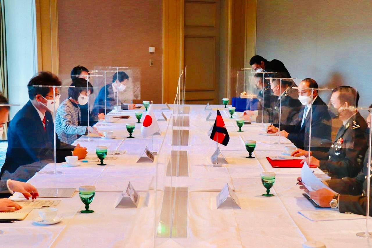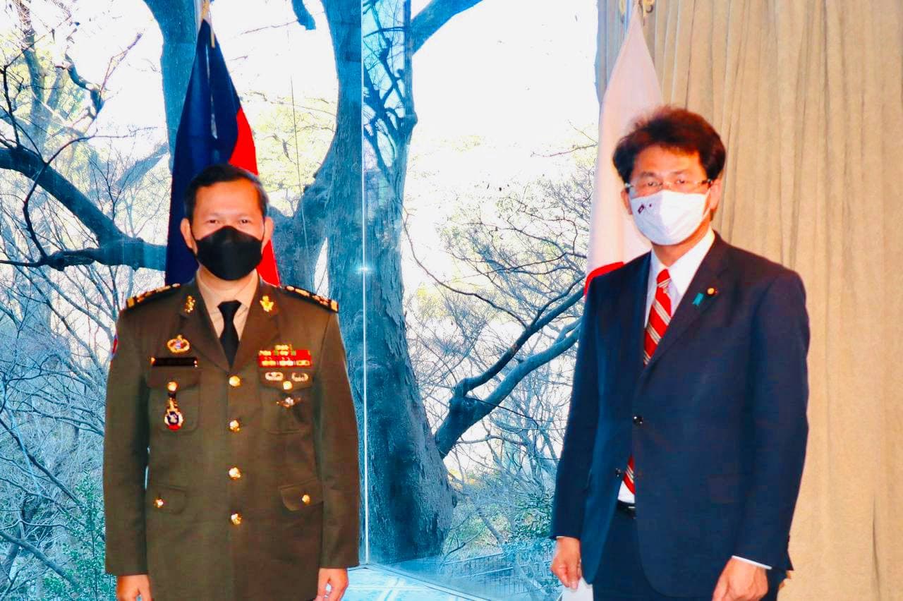 នាព្រឹកថ្ងៃទី១៧ ខែកុម្ភៈ ឆ្នាំ២០២២ មុននឹងអញ្ជើញនិវត្តមកកាន់មាតុប្រទេសវិញ ក្រោយបញ្ចប់ដំណើរទស្សនកិច្ចផ្លូវការរយៈពេល ០៤ ថ្ងៃក្នុងប្រទេសជប៉ុន ឧត្តមសេនីយ៍ឯក ហ៊ុន ម៉ាណែត អគ្គមេបញ្ជាការរងនៃកងយោធពលខេមរភូមិន្ទ មេបញ្ជាការកងទ័ពជើងគោក និងគណៈប្រតិភូកងទ័ពជើងគោកកម្ពុជា បានជួបសំណេះសំណាល និងពិភាក្សាការងារជាមួយឯកឧត្តម Miyake Shingo អនុរដ្ឋមន្ត្រីការបរទេសនៃប្រទេសជប៉ុន។