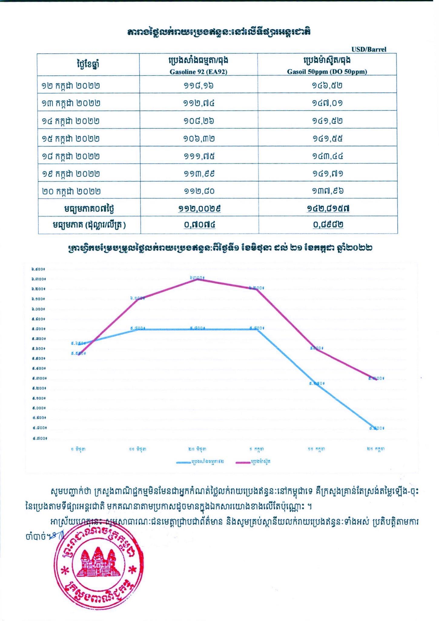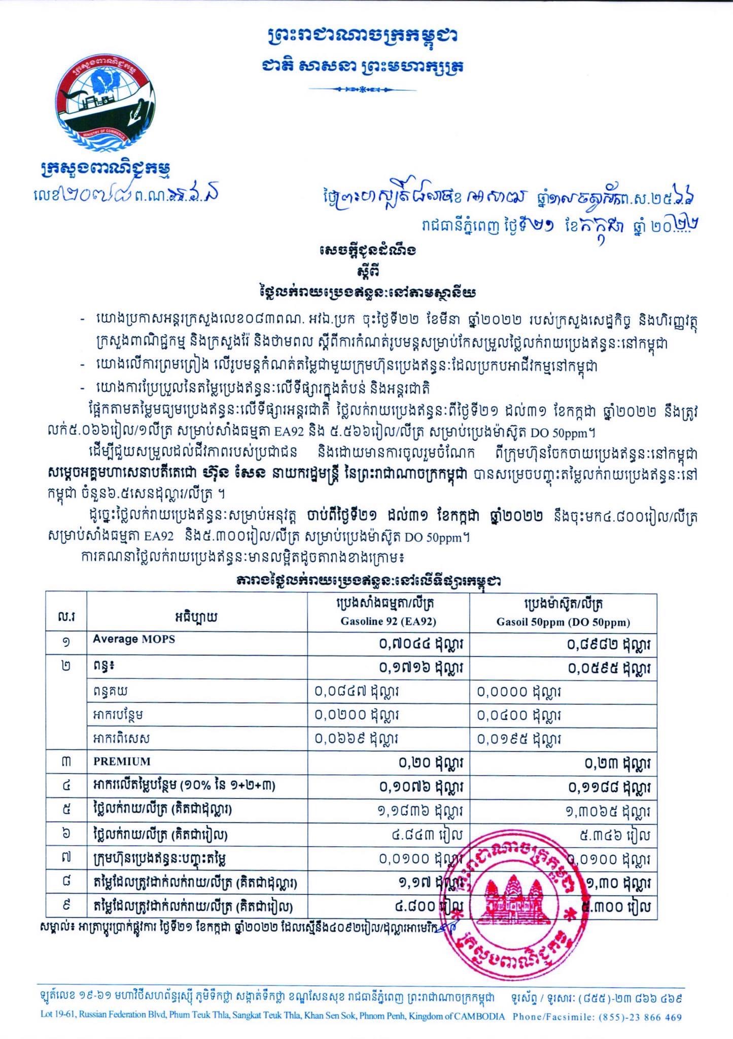 ក្រសួងពាណិជ្ជកម្ម បានជូនដំណឹងពីថ្លៃលក់រាយប្រេងឥន្ធនៈនៅតាមស្ថានីយចាប់ពីថ្ងៃទី២១ រហូត ដល់ថ្ងៃទី៣១ ខែកក្កដា ឆ្នាំ២០២២នេះ ក្នុងតម្លៃប្រេងសាំងធម្មតាលក់ ៤៨០០រៀលក្នុងមួយលីត្រ គឺធ្លាក់ចុះ៤៥០រៀល ខណៈប្រេងម៉ាស៊ូតវិញ ៥៣០០រៀល ក្នុងមួយលីត្រ គឺធ្លាក់ចុះ៣០០រៀល៕