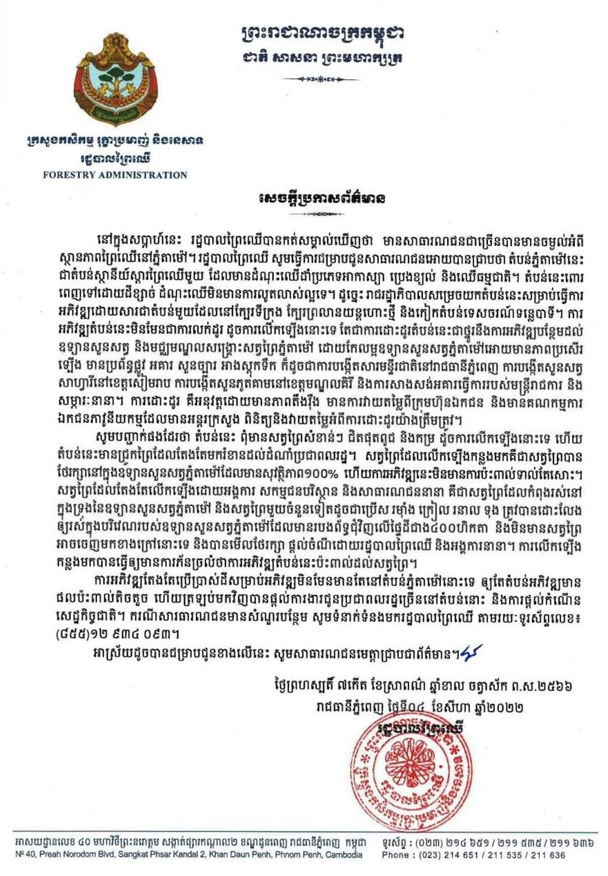 រដ្ឋបាលព្រៃឈើ លើកឡើងទៀតថា សត្វដែលតែងតែលើកឡើងដោយអង្គការ សង្គមជនបរិស្ថាន និងសាធារណជននានា គឺជាសត្វព្រៃដែលកំពុងរស់នៅក្នុងទ្រុងនៃឧទ្យានសួនសត្វភ្នំតាម៉ៅ និងសត្វព្រៃមួយចំនួនទៀតដូចជាប្រើស រមុាំង ក្រៀល រនាល ទុង ត្រូវបានដោះលែងឱ្យរស់ក្នុងបរិវេណរបស់ឧទ្យានសួនសត្វភ្នំតាម៉ៅ ដែលមានរបងព័ទ្ធជុំវិញលើផ្ទៃដីជាង ៤០០ហិកតា និងមិនមានសត្វព្រៃអាចចេញមកខាងក្រៅនោះទេ និងបានមើលថែរក្សា ផ្តល់ចំណីដោយរដ្ឋបាលព្រៃឈើ និងអង្គការនានា។ ការលើកឡើងកន្លងមក បានធ្វើឱ្យមានការភ័ន្តច្រលំថា ការអភិវឌ្ឍតំបន់នេះប៉ះពាល់ដល់សត្វព្រៃ៕