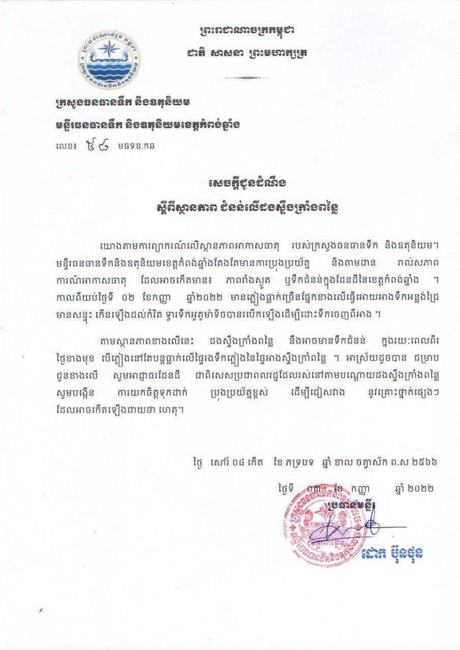 កំពង់ឆ្នាំង ៖ ប្រធានមន្ទីរធនធានទឹក និង ឧតុនិយម ខេត្តកំពង់ឆ្នាំង លោកដោក ប៊ុនថុន នៅថ្ងៃទី៣ ខែកញ្ញា ឆ្នាំ២០២២នេះបានចេញសេចក្តីជូនដំណឹងមួយ ដោយអំពាវនាវឲ្យអាជ្ញាធរ ជាពិសេសបងប្អូនប្រជាពលរដ្ឋរស់នៅតាមដងស្ទឹងក្រាំងពន្លៃ បង្កើនការប្រុងប្រយ័ត្នខ្ពស់ ដោយសារតែមានភ្លៀងធ្លាក់ខ្លាំង នៅផ្នែកខាងលើអាងទឹកអន្លង់ជ្រៃ រហូតទ្វារបើកដោយស្វ័យប្រវត្តិទៀតផង ។
