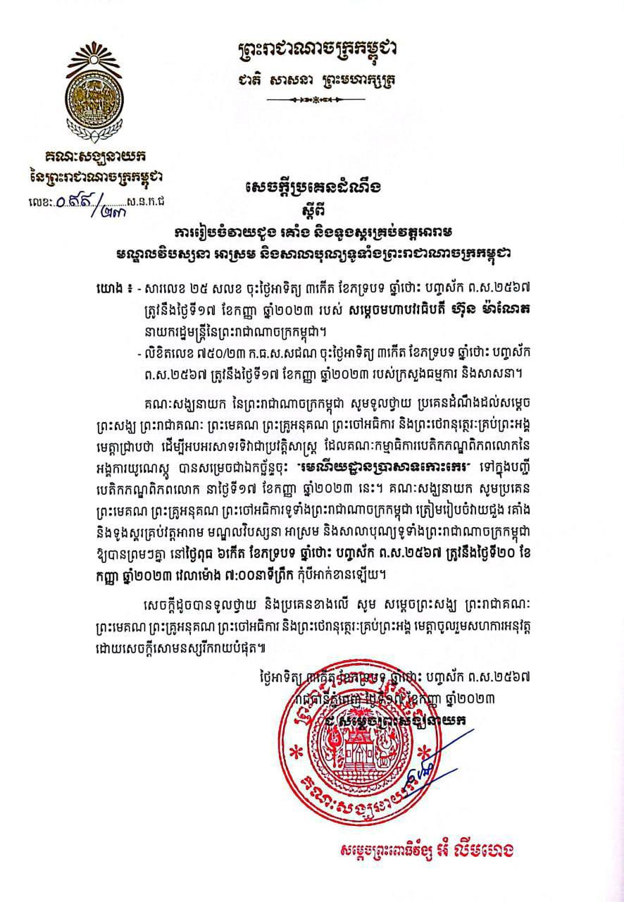 គណៈសង្ឃនាយកនៃព្រះរាជាណាចក្រកម្ពុជា បានចេញលិខិតទូលថ្វាយ ប្រគេនដំណឹងដល់សម្ដេចព្រះសង្ឃ ព្រះរាជាគណៈ ព្រះមេគណ ព្រះគ្រូអនុគណ ព្រះចៅអធិការ និងព្រះថេរានុត្ថេរៈគ្រប់ព្រះអង្គ មេត្តាជ្រាបថា ដើម្បីអបអរសាទរទិវាជាប្រវត្តិសាស្ត្រ ដែគណៈកម្មាធិការបេតិកភណ្ឌពិភពលោក នៃអង្គការយូណេស្កូ បានសម្រេចជាឯកច្ឆ័ន្ទ ចុះរមណីយដ្ឋានប្រាសាទកោះកេរ ទៅក្នុងបញ្ជីបេតិកភណ្ឌពិភពលោក នាថ្ងៃទី១៧ ខែកញ្ញា ឆ្នាំ២០២៣ គណៈសង្ឃនាយកសូមប្រគេនព្រះមេគណ ព្រះគ្រូអនុគណ ព្រះចៅអធិការត្រៀមរៀបចំវាយជួង រគាំង និងទូងស្គរគ្រប់វត្តអារាម មណ្ឌលវិបស្សនា អាស្រម និងសាលាបុណ្យទូទាំងប្រទេសកម្ពុជាឱ្យបានព្រមៗគ្នា នៅថ្ងៃពុធ ៦កើត ខែភ ទ្របទ ឆ្នាំថោះ បញ្ចស័ក ព.ស.២៥៦៧ ត្រូវនឹងថ្ងៃទី២០ ខែកញ្ញា ឆ្នាំ២០២៣ វេលាម៉ោង ៧:០០នាទីព្រឹក កុំបីអាក់ខានឡើយ ។