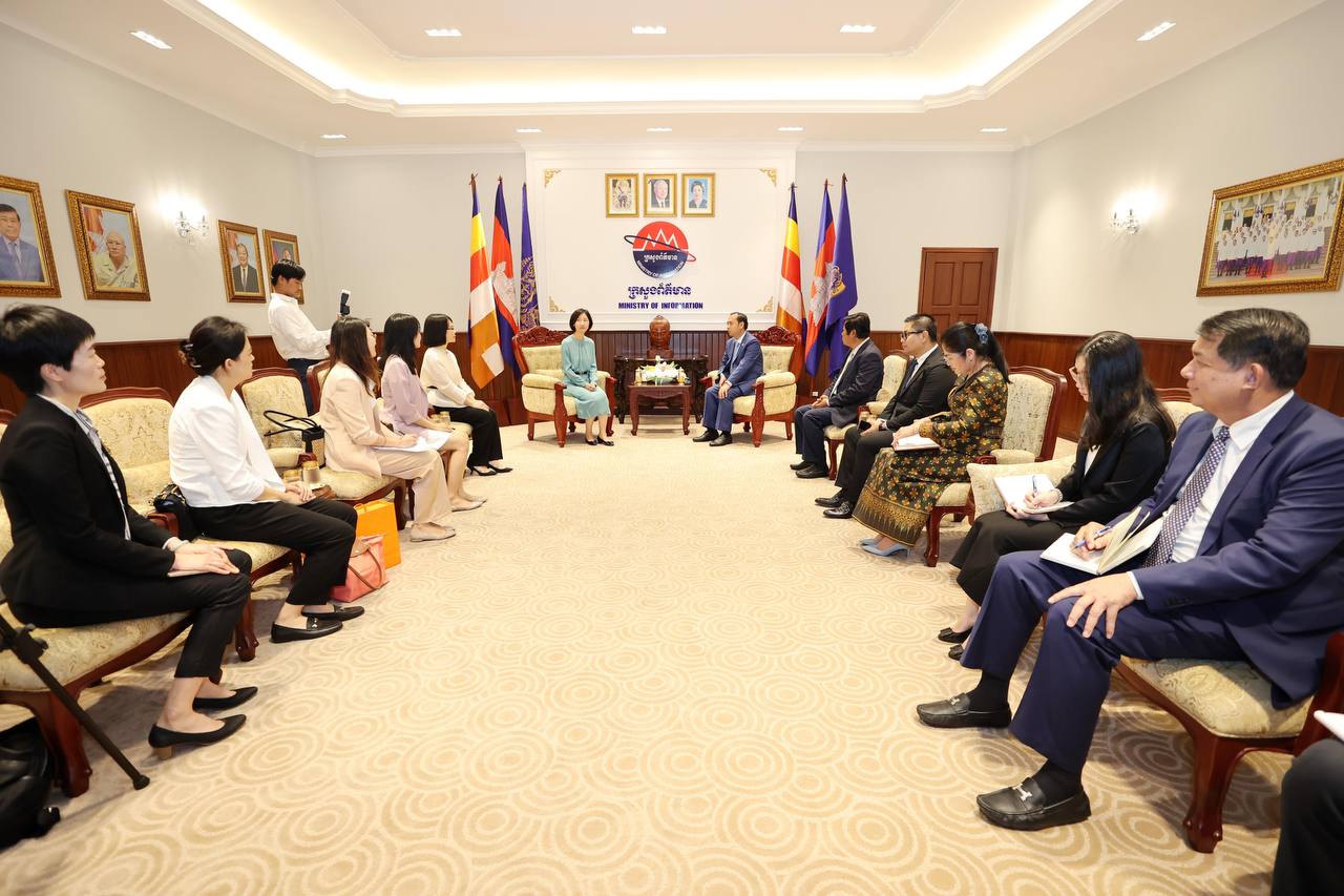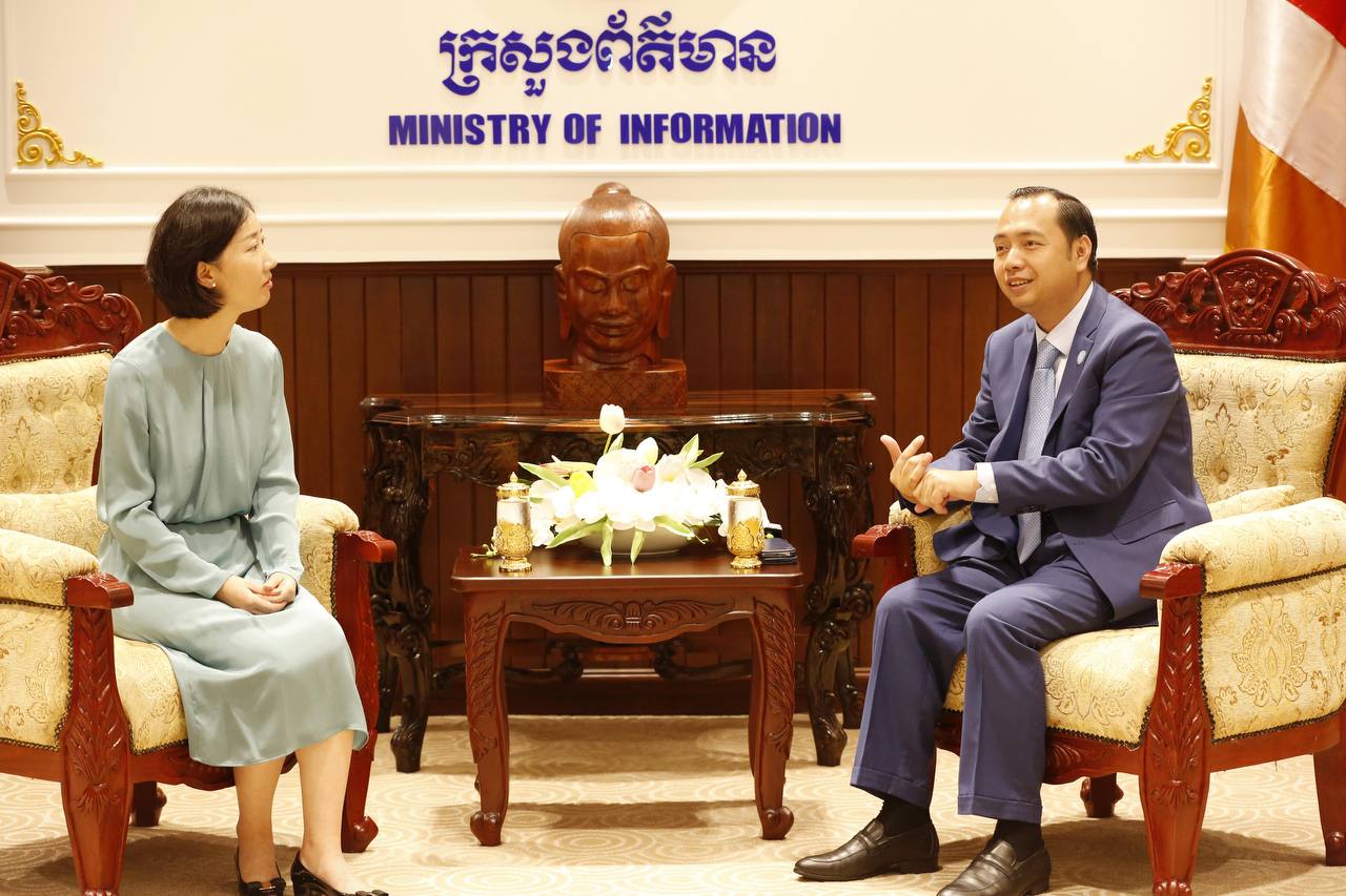 ឯកឧត្តម នេត្រ ភក្ត្រា រដ្ឋមន្ត្រីក្រសួងព័ត៌មាន បានទទួលជួបពិភាក្សាការងារជាមួយគណៈប្រតិភូប្រពន្ធ័ផ្សព្វផ្សាយ CMG ប្រទេសចិន ដឹកនាំដោយ អ្នកនាង Xu Xiaoxia អនុប្រធានផ្នែកភាសាខ្មែរ នៃមជ្ឈមណ្ឌលកម្មវិធីភាសាតំបន់អាស៊ី និងអាហ្វ្រិក នៃអគ្គស្ថានីយវិទ្យុ និងទូរទស្សន៍មជ្ឈិមចិន នៅព្រឹកថ្ងៃទី១៥ ខែវិច្ឆិកា ឆ្នាំ២០២៣ នាទីស្តីការក្រសួងព៏ត៌មាន។